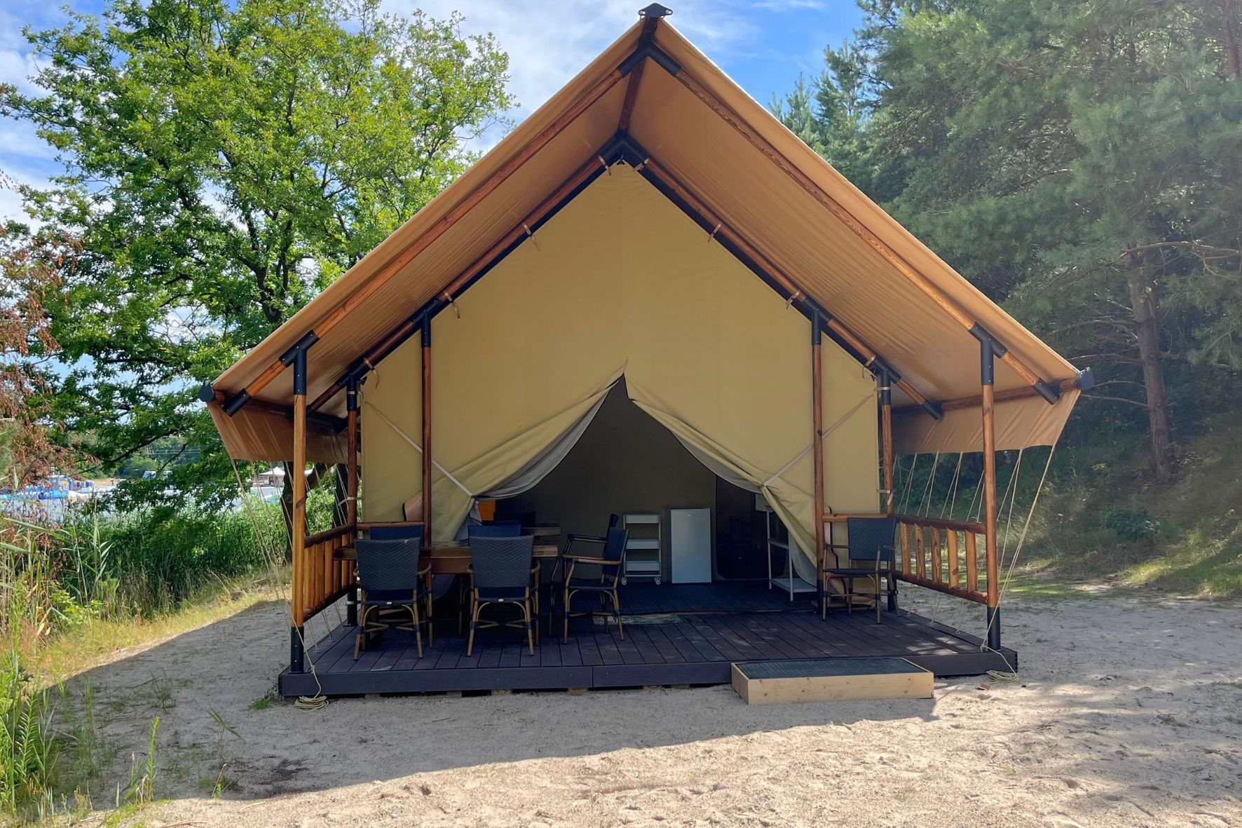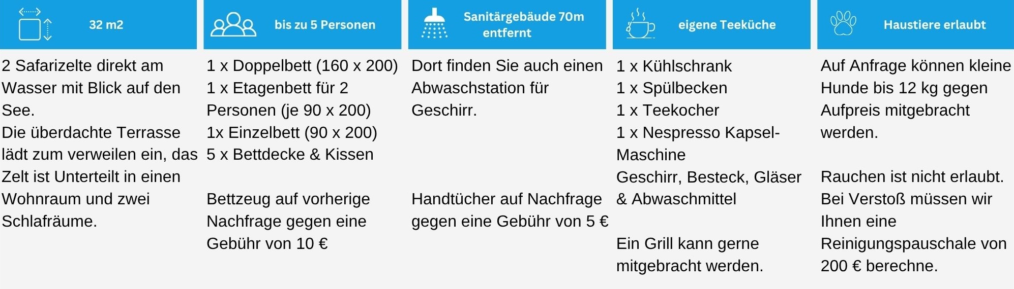 Unser Safarizelt liegt direkt am See und bietet Platz für 5 Personen. Auf 32m2 befinden sich: